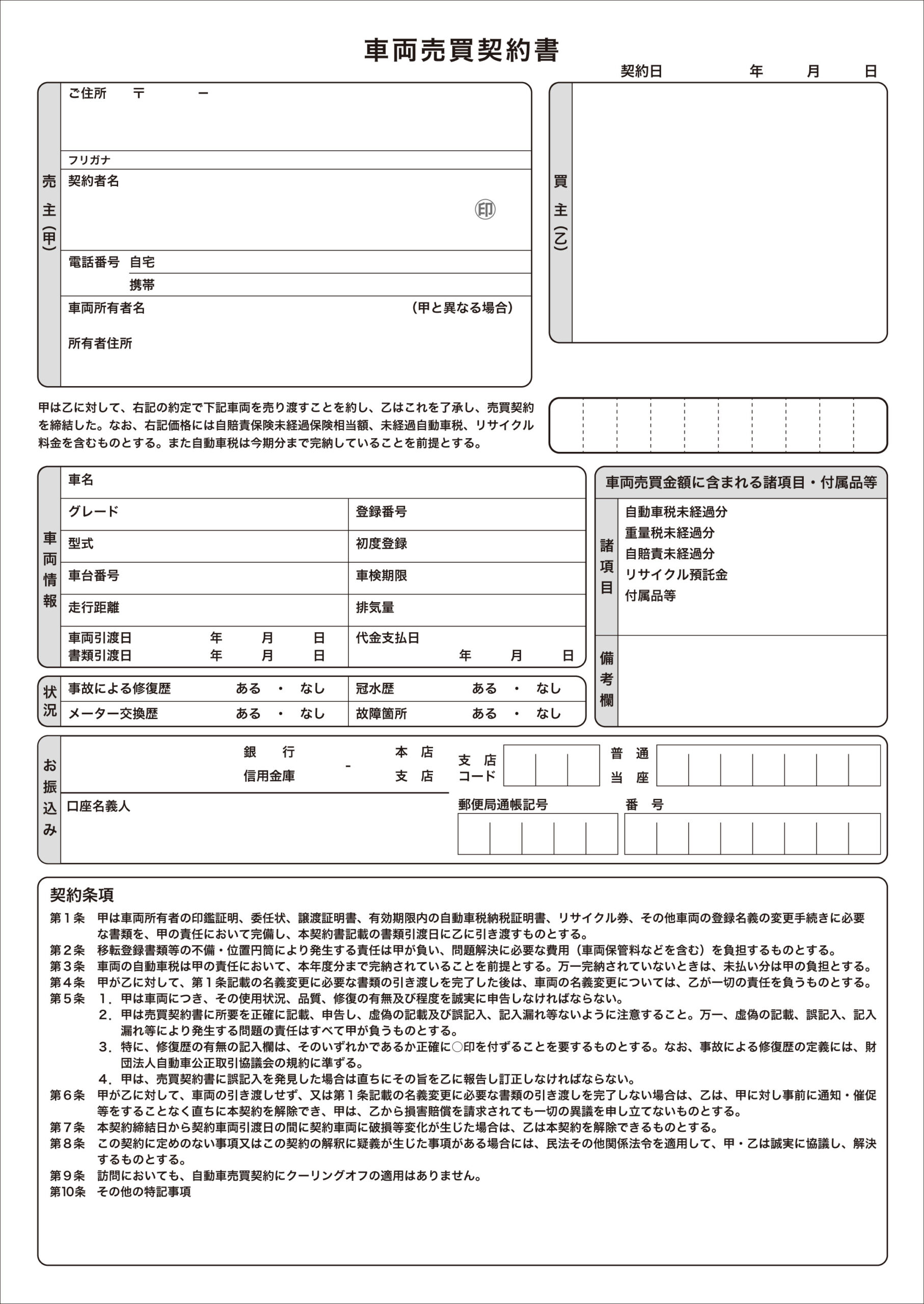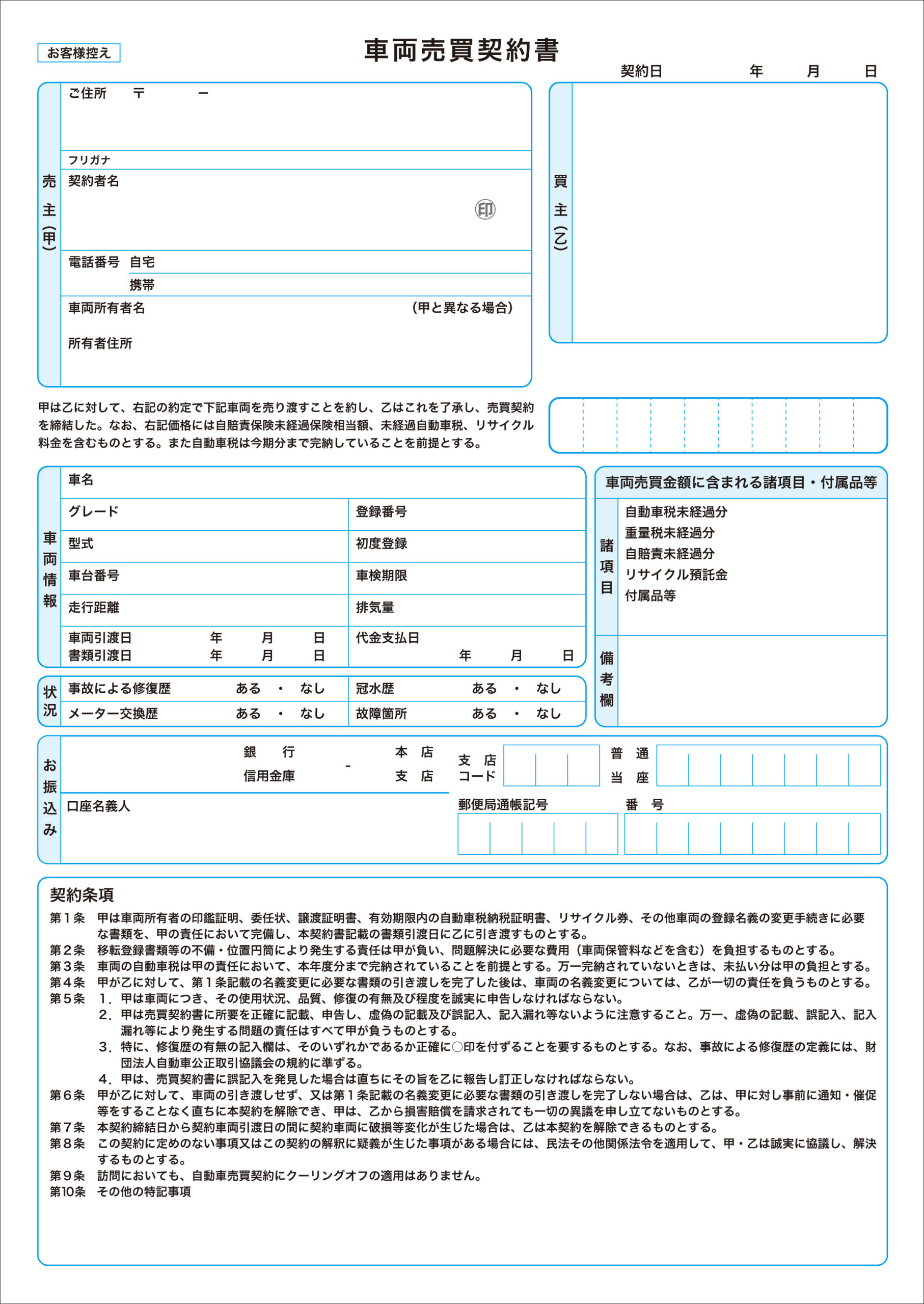 <車両売買契約書(1)、B5サイズ2枚複写伝票>複写枚数、サイズ変更可